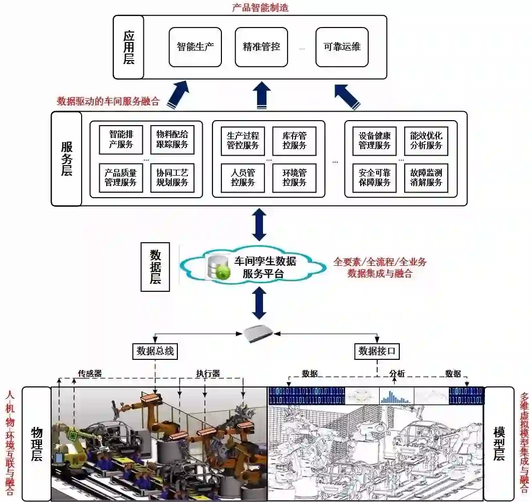 融合了物理-信息数据的车间孪生数据不仅能反映物理车间和虚拟车间的运行情况,反之也能驱动并影响物理车间和虚拟车间的运行。如何基于车间孪生数据,结合现有信息系统,形成车间生产运行过程中所需的各类服务(如智能排产服务、产品质量管理服务、协同工艺规划服务、生产过程管控服务、设备健康管理服务、能效优化分析服务等),从而以融合服务协作的方式,实现车间智能生产、精准管控、可靠运维等智能目标,是物理融合、模型融合、数据融合在车间生产应用的最终体现。以上过程定义为数据驱动的服务融合[1]。