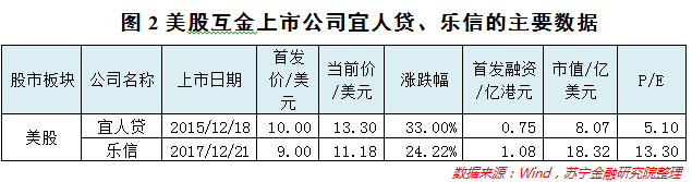 从财富变现上看,2018年港股上市的3家公司,当前价(3月12日收盘价,下同)较首发价下降了20%-60%不等,2018年美股上市的6家公司,除微贷网、点牛金融之外,其他4家的当前价较首发价下降了10%-30%不等。整体而言,虽目前价格有所下跌,但依旧可以实现相对可观的财富变现,因为P/E(每股市价/每股盈余)倍数多数维持在5倍以上,即公司1元钱的利润可产生5元钱以上的估值。