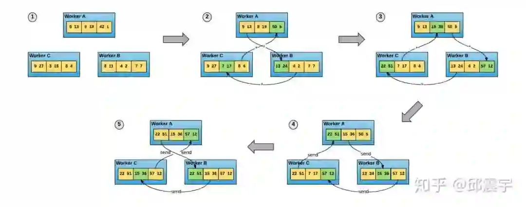 它主要实现原则是每个worker节点只会与它的左节点和右节点进行通信,其中每个节点上会先开辟一个buffer存储要通信的数据,每次通信传输的都是buffer中的某块数据。假设一共有N个节点,那儿每个节点会与它的左右邻居节点通信2*(N-1)次。在第一轮的N-1次通信时,每个节点会把接收到的数据库与对应index上的数据快进行相加(图上1-3),这个阶段一般叫scatter-reduce;在第二轮的N-1次通信时,每个节点会将收到的数据块直接替换掉对应index的数据块(图上4-5),这个阶段一般叫allgather,最后所有 worker节点都会得到完整的融合后的数据。