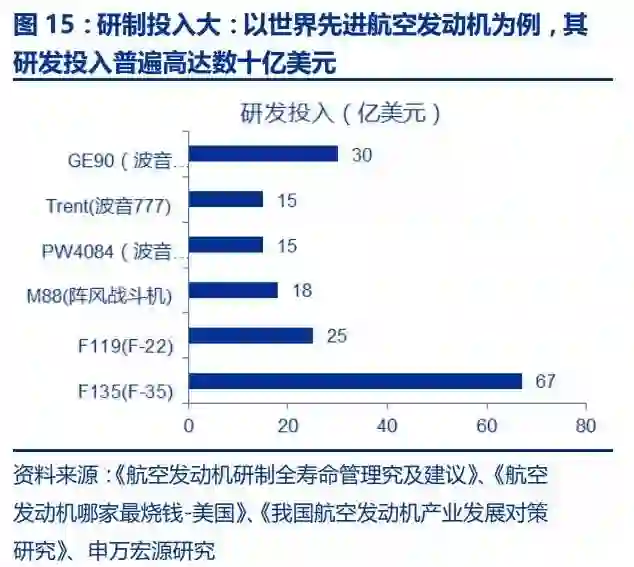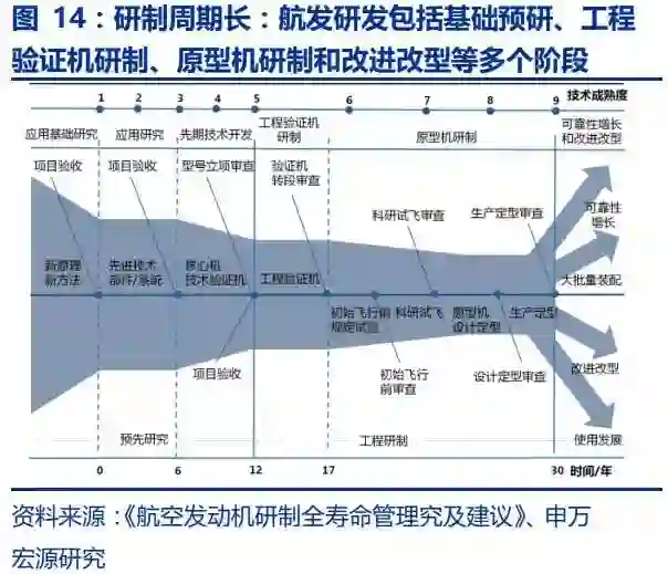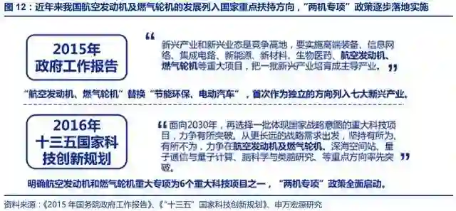 在两机专项政策的牵引下,飞发分离措施落地和资金投入大幅上升有望使发动机研制技术的体制问题和投入问题得到解决。我国在建立航空工业之始学习苏联模式,以飞机型号研发驱动航空发动机型号配套,航空发动机研制缺乏独立自主性,在航空发动机研发周期比飞机研发周期更长的事实下,航空发动机产业发展受到严重制约。2015年,在我国政府工作报告中首次将航空发动机和燃气轮机作为独立方向列入七大新兴产业,2016年《“十三五”国家科技创新规划》中也明确航空发动机和燃气轮机重大专项(即“两机专项”)为6个重大科技项目之一,“两机专项”政策全面启动。在这一政策的推动下,中国航空发动机集团公司于2016年成立,这标志着我国航空发动机研制正式独立于飞机制造,给予了航空发动机研制更强的自主性,从根源上解决了航空工业的体制问题。同时,这一政策也有效缓解了研制发动机的巨额资金投入压力,据人民网报道,市场预计未来十年将投资不少于1000亿元用于先进航空发动机的研发和生产。