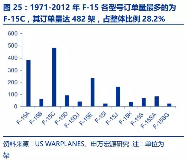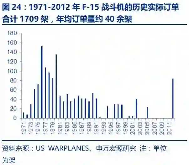 F-15型号系列化支撑订单放量,1971-2012年历史实际订单价值高达八百亿美元。据USWARPLANES统计,截止美国2012财年年底,F-15的历史实际订单合计1709架,其中,主要机型F-15A耗时九年完成384架的订单,F-15C耗时十五年完成482架的订单,衍生型号贡献了主要的订单来源。从订单放量节点来看,自1971年F-15战斗机开始出现订单以来,其年订单量迅速升至1976年的峰值153架,后逐渐下降并于1981~1991年间稳定在年均订单量45架左右,1991年之后20年仍有部分年份F-15的订单在20架以上。据美国国防部预算数据,按照F-15单价49.31百万美元计算,历史实际订单F-15的价值量约为842.78亿美元。
