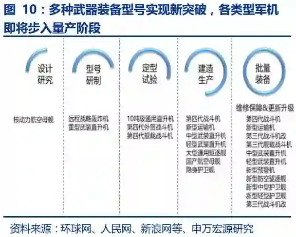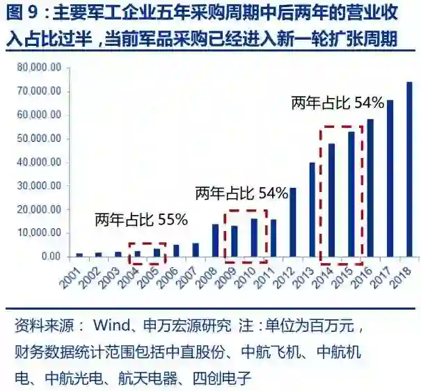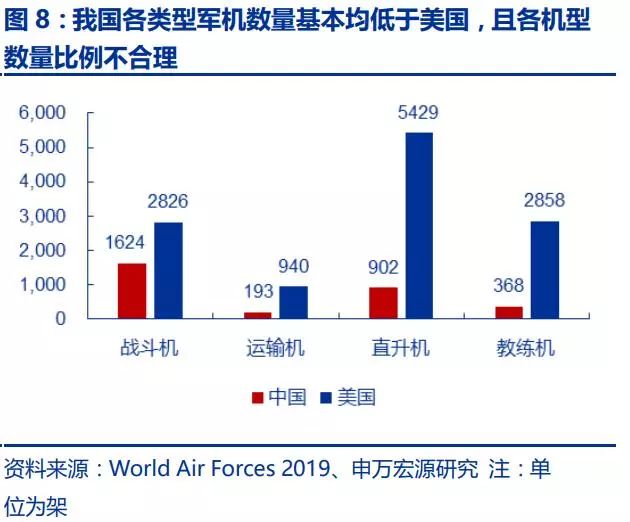 新一轮军品采购扩张周期与新型军机型号量产周期共振,军用飞机加速交付或将牵引航空发动机需求放量。目前我国的军品采购模式依然是计划经济体制下的指令计划模式,军品支出大抵遵循五年周期模式,在五年内军品采购金额前低后高、逐年增长。在主要军工企业的财务数据统计中可以看出,它们在五年采购周期中后两年的营业收入占比大约维持在55%左右,符合军品采购逻辑。由此可以推断得到,2019、2020年或将迎来新一轮军品采购扩张周期,军用飞机采购需求或将加速释放。同时,我国在各类武器装备型号的研制上也陆续实现新突破,四代战斗机、新型运输机、新型武装直升机、中型通用直升机等军用飞机已经或者即将进入批量生产阶段。军品采购额周期性上行叠加新型军机步入量产阶段将有效牵引航空发动机需求释放,国内航发产业的增长拐点或将到来。