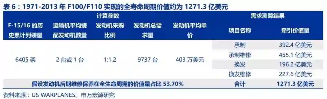 (二)历史数据表明,由F15/16系列战斗机的需求牵引,F100/110已经实现高达1271.3亿美元的全寿命周期价值