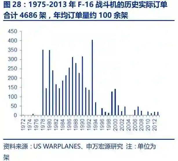 F-16型号系列化支撑订单放量,1975-2013年历史实际订单价值高达千亿美元。据USWARPLANES统计,截止到美国2013财年年底,F-16的历史实际订单合计4696架,其中主要机型F-16A/F-16B耗时十七年完成1736架的订单,F-16C/D也累计完成了2745架订单。由此可以看出,F-16自身型号的不断改进改型保证了其订单的持续放量。订单量变动方面,F-16战斗机的订单量于1978年迅速达到高位352架,随后便一直在年订单量150架以上的较高水平上维持了十余年,自1994年以后,该机型订单量逐渐下滑,2000年至2013年间基本保持在年均30架左右的较低水平。据美国国防部预算数据,按照F-16单价28.84百万美元计算,F-16的历史实际订单价值量约为1354.33亿美元。