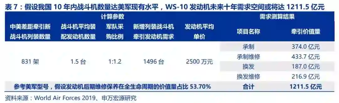 我们分析预测,为弥补中美差距,未来十年内我军可能会列装的配备WS-10的新战斗机数量为831架,牵引的WS-10发动机的市场空间预计达1211.5亿元。由于涡扇-10是新研制型号,因此仅考虑增量市场承制和维修的需求空间,存量市场的维修需求忽略不计。根据WorldAirForces2019的统计,美军目前的F15/16战斗机数量为1412架,中国军队目前的J10/11/15/16战斗机共581架。随着十九大以来强军计划的推进,假设中国军队在10年内战斗机列装数量达到美军现有水平,则配备WS-10的新战斗机列装数量为831架。在承制方面,按照一架战斗机平均装配1.5台发动机、军队以1:1.2比例采购发动机(剩余部分留作备用)计算,同时参考美军发动机型号,假设10年内发动机维修保养费用在价值量中占比53.70%;在换发方面,以10年内战斗机平均更换0.5次发动机测算,并且这部分发动机同样需要维修保养。综合来看,涡扇-10发动机未来10年内由新机牵引的市场空间为1211.5亿元,年均121.2亿元。