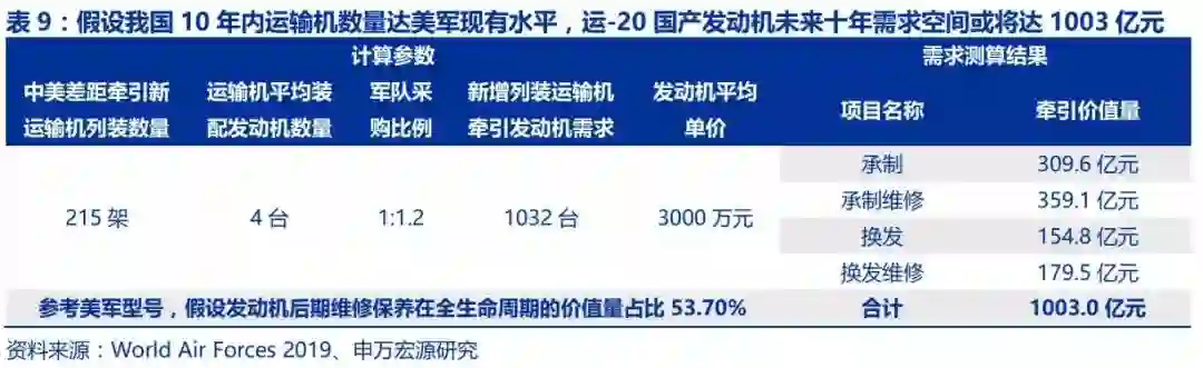 我们分析预测,为弥补中美差距,未来十年内我军可能会列装的配备运-20国产发动机的新运输机数量为215架,牵引的我国运-20国产发动机的市场空间预计达1003.0亿元。由于运-20装配的大涵道比发动机是新研制型号,因此仅考虑增量市场,存量市场的维修需求忽略不计。根据WorldAirForces2019的统计,美军目前的C-17运输机数量为222架,中国军队目前的运20数量为7架,远低于美军的水平。假设中国军队在10年内运输机列装数量达到美军现有水平,则配备该款发动机的新运输机列装数量为215架。在承制方面,按照一架运输机平均装配4台发动机、军队以1:1.2比例采购发动机(剩余部分留作备用)计算,同时参考美军发动机型号,假设10年内发动机维修保养费用在价值量中占比53.70%;在换发方面,以10年内运输机平均更换0.5次发动机测算,并且这部分发动机同样需要维修保养。综合来看,该型号发动机未来10年内由新机牵引的的市场空间为1003亿元,年均100.3亿元。