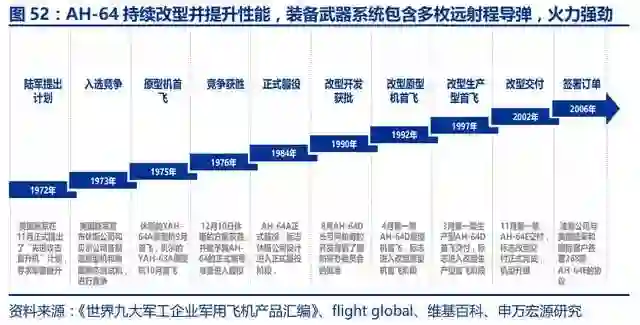 AH-64多年间持续进行型号改良,先后获得美国陆军多份生产合同。越战中武装直升机AH-1表现良好,促使美国陆军决心发展更为先进的战斗直升机,因此1972年美国陆军提出“先进武装直升机计划”(AAH)计划,其目的是要提供陆军一种全天候型全能型攻击直升机,并可用来对付敌人的装甲和其他强化过的目标;1973年,美国陆军挑选了贝尔公司的YAH-63和休斯公司的YAH-64参与这项计划;1976年美国陆军宣布休斯公司的YAH-64获胜,并赋予其AH-64的正式编号;1984年AH-64A正式服役,且休斯向麦道出售直升机制造业务;1997年AH-64D生产型首飞并交付;2011年AH-64E开始交付;2017年波音取得AH-64E的购买合同。