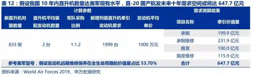 我们分析预测,为弥补中美差距,未来十年内我军可能会列装的中型通用直升机数量约为843架,牵引的直-20国产航发的市场空间预计高达647.7亿元。由于直-20国产航空发动机是新研制型号,因此仅考虑增量市场,存量市场的维修需求忽略不计。根据WorldAirforce2019,当前美国拥有AH-64/UH-60武装直升机833架(含32架未交付订单),我国武装直升机数量面临严重缺口。随着十九大以来强军计划的推进,假设中国军队在10年内直升机列装数量达到美军现有水平,则配备大功率涡轴发动机的新直升机列装数量约为833架。在承制方面,按照一架直升机平均装配2台发动机、军队以1:1.2比例采购发动机(剩余部分留作备用)计算,同时参考美军发动机型号,假设10年内发动机维修保养费用在价值量中占比53.70%;在换发方面,以10年内直升机平均更换0.5次发动机测算,并且这部分发动机同样需要维修保养。综合来看,直-20国产大功率涡轴发动机未来10年内由新机牵引的市场空间为647.7亿元,年均64.8亿元。
