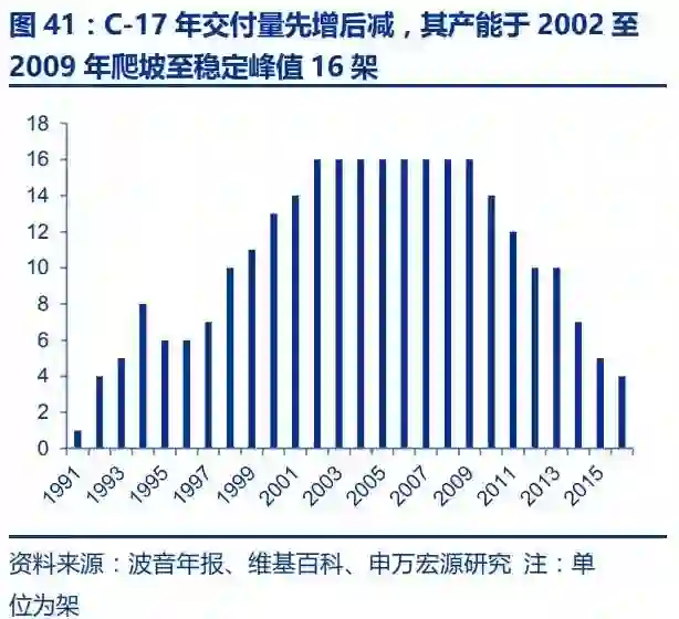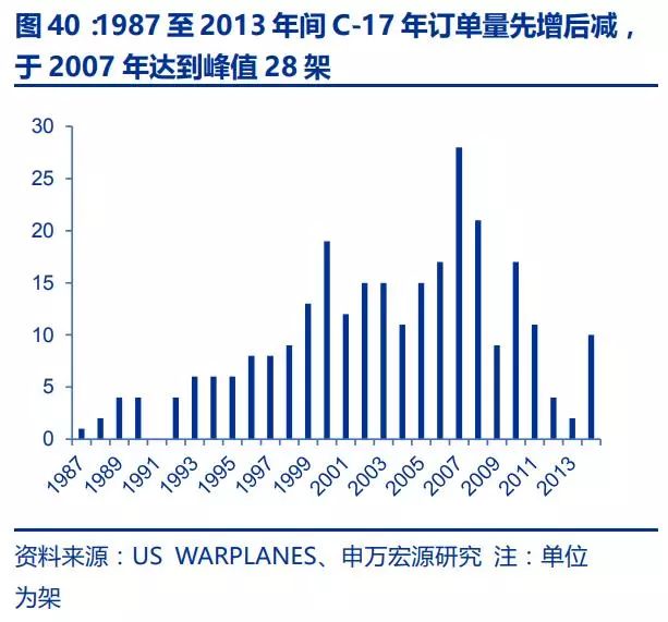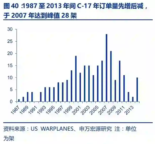 1987-2013年间C-17历史累计列装量价值约七百亿美元。根据美国LongBeachPress-Telegram报道,C-17的历史累计列装量为279架。由USWARPLANES的数据分析可知,C-17的历史实际订单遵循先增后减规律,于2007年达到峰值28架;依照波音年报及维基百科统计,C-17的列装峰值同样表现出先增后减规律,产能爬坡至稳定水平花费近十年,于2002至2009年达到平稳交付量峰值16架。据美国国防部预算数据,按照C-17单价257.03百万美元计算,历史累计列装C-17的价值量约为717.10亿美元。该型号飞机最大的客户是美国空军,12个军事基地中共计有223架C-17。除美国以外,英国、澳大利亚、加拿大、科威特、卡塔尔、阿拉伯联合酋长国、印度等国家的战略空运部队都装备有C-17运输机。