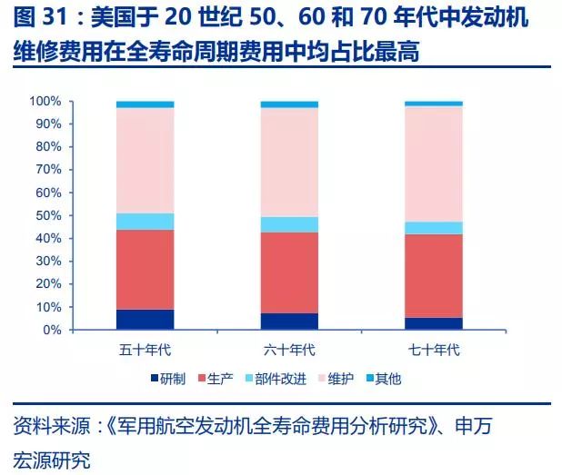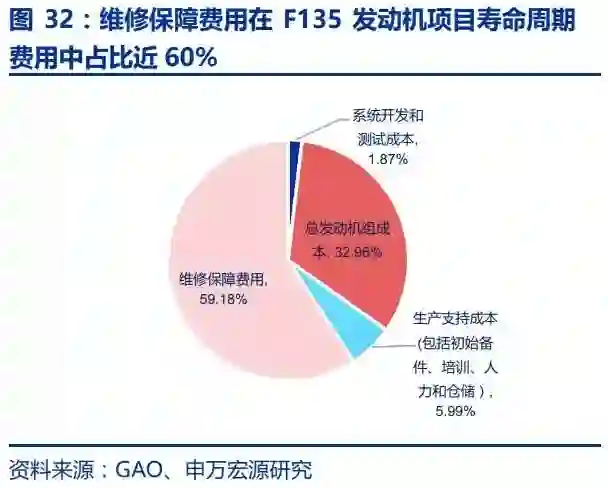 发动机的后期使用保障费用在全寿命周期内占比接近50%。按美国国防部《重要武器系统研制和采购程序》,一台军用航空发动机全寿命期可以划分为方案、验证、研制、生产/采购、使用/后勤保障等五个阶段,而寿命周期费用则为相应阶段一系列费用的总和,主要由研制费用、采购费用和使用保障费用三部分组成,且使用保障费用占比较大。以美国早期发动机寿命周期费用为例,研制费用占全寿命费用的5.4%-8.9%,比重逐渐下降;生产费用占全寿命费用的34.9%-36.1%,比重逐渐上升;维护费用占全寿命费用的46.2%-50.2%,比重逐渐上升,由此可见一台军用发动机的后期使用和保障费用占全寿命周期的价值比例相当高,而且根据美国GAO分析,F135发动机的使用保障费用在发动机全寿命周期中的占比高达59.18%,发动机的后期维护和保障市场大有可为。