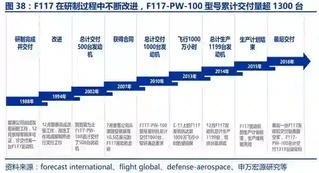 F117由商用涡扇发动机改型而来,其研发历时十余年,累计交付数量超千台。F-117由民用发动机改进而来,民用发动机对安全可靠性要求较高,F-117在此基础上进行改进,研制进程比较顺利,没有很多系列化的产品,能很好的符合军方标准。1988年,为配套波音大型军用运输机C-17,F117发动机开始研制,1988年12月普惠完成改型工作并进行交付;1994年普惠继续对原发动机型号进行改进;2010年研制完成的F117-PW-100型号发动机已交付千台;2013年C-17运输机配备的F117发动机飞行时间已达1000万小时;2015年F117发动机生产计划结束;2016年最后一台F117发动机交付美国空军,F117-PW-100累计交付1313台发动机。