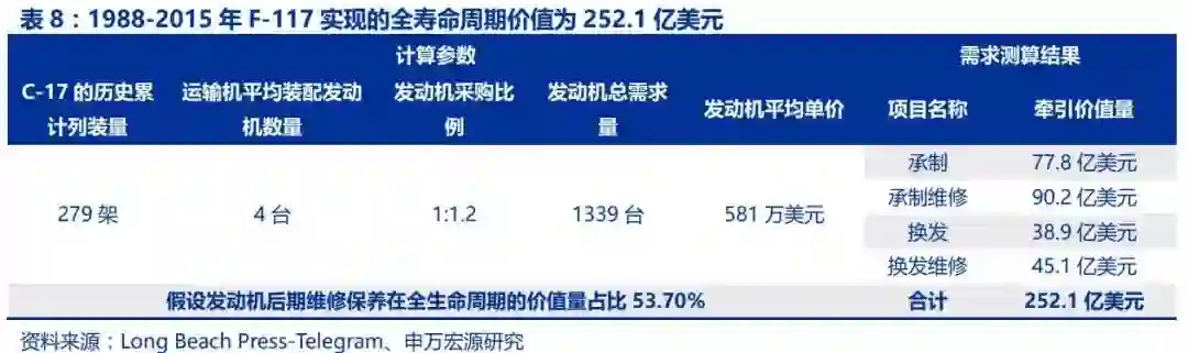 F117发动机由C-17系列运输机牵引的新机承制价值量共计为77.8亿美元。根据美国LongBeachPress-Telegram报道,1988-2015年C-17的历史累计列装量为279架。对飞机全寿命期进行阶段划分:在发动机采购阶段,按照一架C-17配4台F-117发动机计算,历史累计列装的C-17运输机配套F117发动机1116台,按照美国空军预算的数据,F-117历史均价约为581万美元,那么配套发动机价值大约64.8亿美元;依照军队发动机采购比例1:1.2,因而备用F117发动机224台,备用发动机价值大约13.0亿美元。