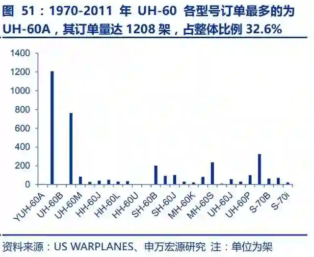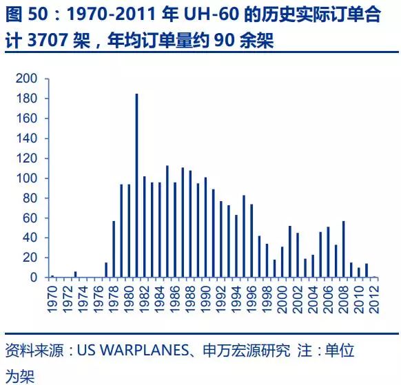 UH-60系列化支撑订单放量,1970-2011年历史实际订单价值高达七百亿美元。据USWARPLANES统计,截止到美国2012财年年底,UH-60的历史实际订单合计3707架。其中主要机型UH-60A耗时十二年完成1208架的订单,UH-60L耗时十九年完成764架的订单,其余各机型中也有部分型号获得了不错的订单量,由此可以看出,UH-60自身型号的不断改进改型保证了其订单的持续放量。从时间序列角度看,UH-60的订单量在1978年开始有明显提升,1981年达到185架的年订单量峰值,随后在1982-1996年间稳定在90架左右,1996年以后订单量则开始逐渐缓慢下滑。据美国国防部预算数据,按照UH-60单价19.74百万美元计算,UH-60的历史实际订单价值量约为731.90亿美元。
