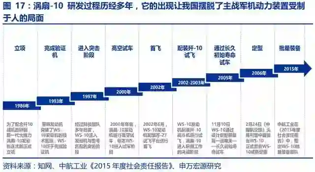 WS-10历时20余载研制终成大国重器,加速推动我国航空发动机完成二代到三代的代际更替。涡扇-10是我国首个具有自主知识产权的大推力涡轮风扇发动机,由沈阳发动机设计研究所的“科学匠人”张恩和及其团队共同研制,采用数十项新技术、新材料和新工艺,用于推动歼-10、歼-11、歼-15、歼-16等战机。太行发动机于1986年立项;1987年进入验证机研制阶段;1993年完成验证机;1997年进入突击阶段;2000年进行高空试车;2002年6月配装苏-27首飞;2002-2003年配装歼-10试飞;2005年通过长久初始寿命试车;2006年2月24日正式宣告成熟定型;2015年已批量装备部队。WS10的生产定型、批量交付标志着我国的航空发动机实现了从第二代到第三代的历史性跨越,同时改变我军主战机种动力受制于人的被动局面。