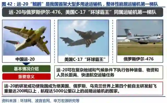 运-20“鲲鹏”是我国首架大型多用途运输机,整体性能水平居运输机第一梯队,有望支持我军实现全域机动的战略目标。运-20"鲲鹏"战略运输机,我国首款国产大型运输机,由西飞集团唐长红总师及其科研团队设计研发。2013年首次试飞成功,2016年交付部队,正式进入空军序列服役。从主要性能参数上看,运-20已超过从俄罗斯引进的的伊尔-76;运-20可在复杂地域和气候条件下执行各种装备、物资和人员长距离、快速航空运输任务。运-20的研发成功使我国成为继美国、俄罗斯、乌克兰世界上第四个能自主研发起飞重量达200吨以上,航程达5000公里以上的战略运输机的国家。从性能水平看,运-20与俄罗斯伊尔-476、美国C-17"环球霸王"等同属运输机第一梯队。