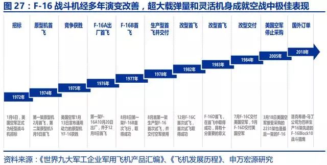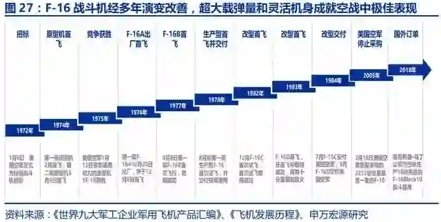 F-16多年间持续进行型号衍生和改进,其超大载弹量和灵活性助力美国保持空中霸权。美国吸取越南空战经验,要求制定空中优势战斗机,因此1972年美国空军正式为轻型战斗机招标,并从投标的五家公司中选定通用动力公司和诺斯罗普公司制造原型机,进行试飞竞争;1973年,通用动力的第一架原型机YF-16出厂,1974年首次试飞;1975年,美国空军宣布通用动力的YF-16入选,正式确定飞机的军用编号为F-16;1976年F-16A首飞;1977年F-16B首飞;1978年生产型F-16首飞并交付空军;1984年F-16C和F-16D交付空军;1993年通用动力向洛克希德公司(现为洛克希德·马丁公司,下文简称洛马)出售飞机制造业务;2005年美国空军接收最后一架F-16;2018年洛马收到为巴林生产F-16的巨额合同。