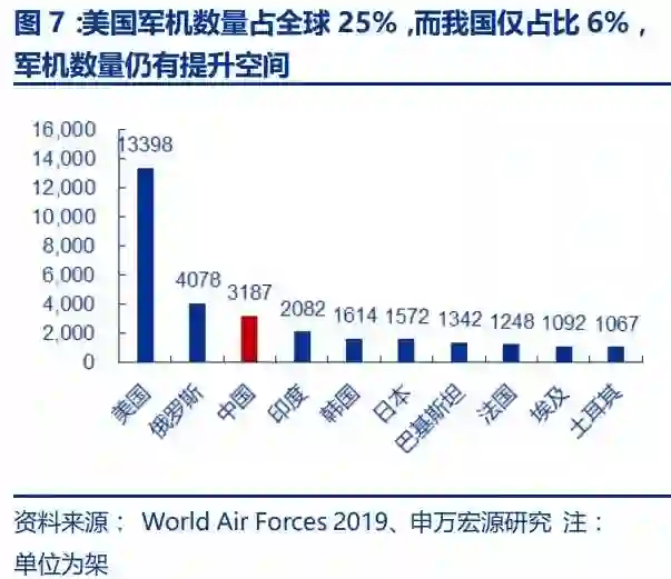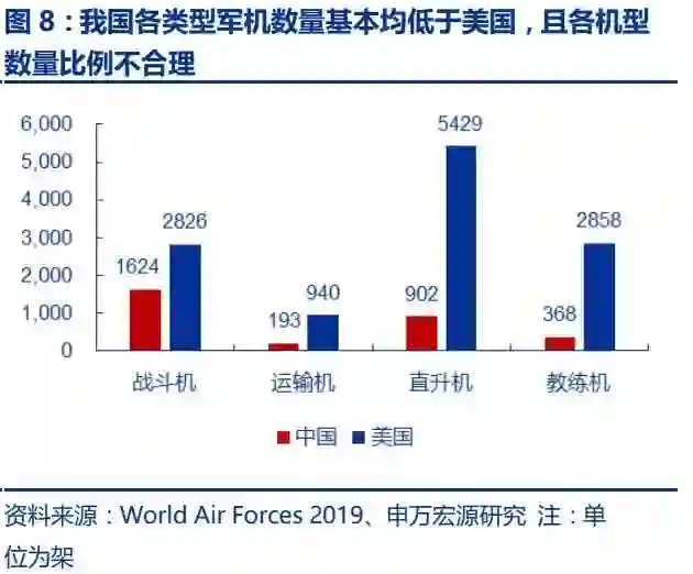 国防和军队现代化建设加速推进,叠加战略转型下我国军机数量不足及结构不合理短板亟待解决,我国军用飞机有望迎来加速列装部署。2017年,十九大报告更新了国防和军队现代化的“三步走”战略,将目标实现时间提前了15年,即2020年基本实现机械化,2035年基本实现国防和军队现代化,2050年建成世界一流军队;同时,我国各类军用机型对标美俄军事强国仍存较大差距,战斗机老旧机型多、远程轰炸机力量薄弱、运输机列装数量不足等短板突出。从用户端来看,陆军从区域防卫型向全域机动型转变,机动作战、立体攻防的战略要求或牵引陆航直升机列装需求;海军从近海防御型向近海防御型与远海防卫型结合转变,或牵引大型运输机及舰载机列装需求;空军从国土防空型向攻防兼备型转变,空天一体、攻防兼备或牵引高性能战机换装列装需求;填补列装缺口、换装提升性能或将推动未来三、四代战机和大型运输机等军用飞机迎来快速列装部署。