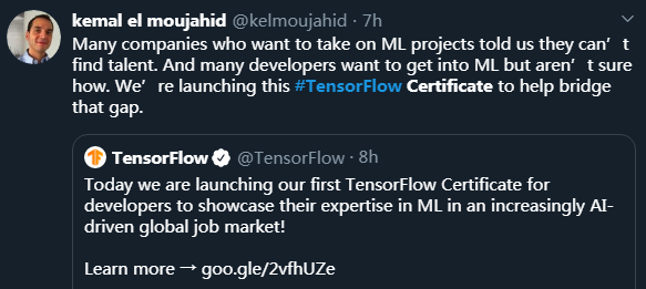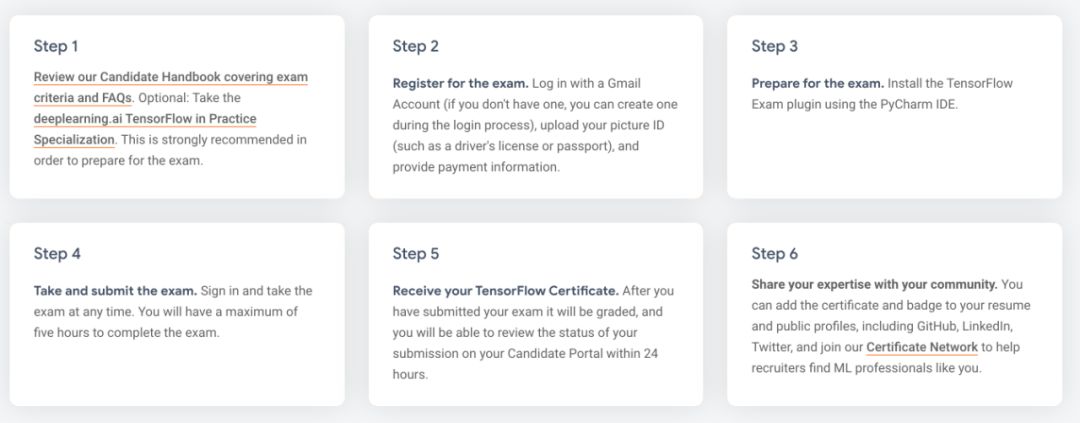 展示你的技能:通过将证书展示在简历和社交平台上,你可以成为顶级科技企业入门级 TensorFlow 开发者职位的候选人。