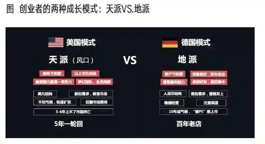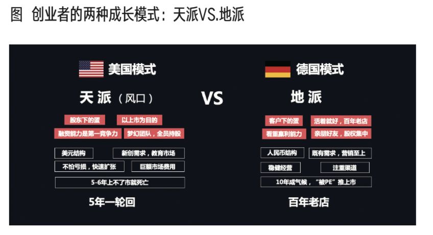 天派企业常常在一开始讲模式的时候就会得到境外资本市场的关注,特别是美元资本,这些创业者最后大多是在美国成就他们的财富梦想。所以,天派企业是典型的美元下的蛋,股东下的蛋。与地派有许多百年老店不同,天派只有30年左右的历史。中国自从1999年互联网公司出现后,才有了天派。这种企业类型是“硅谷+华尔街+纳斯达克”组合的产物。天派企业两头在外——出钱的股东是老外,上市地点也在境外。