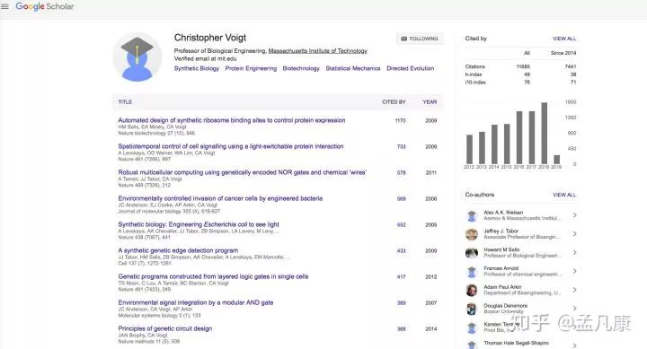 2. 平时要注意关注本领域的一些顶级科学家,比如我所在领域的Chris Voigt,James Collins等等。在谷歌建立的学者页会有列出所有相关的文章,按照引用率的排序,一般引用率比较高的都属于非常好的文章,可以作为经典来读。