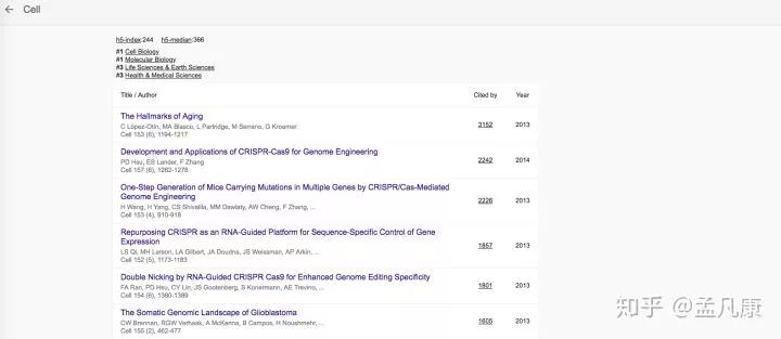 3. 同时无论是谷歌学术搜索都会给出某领域或者某杂志的引用率最高的文章排序,这种以引用率为评价标准的一般问题都不大。比如Cell引用率最高的几篇文章:
