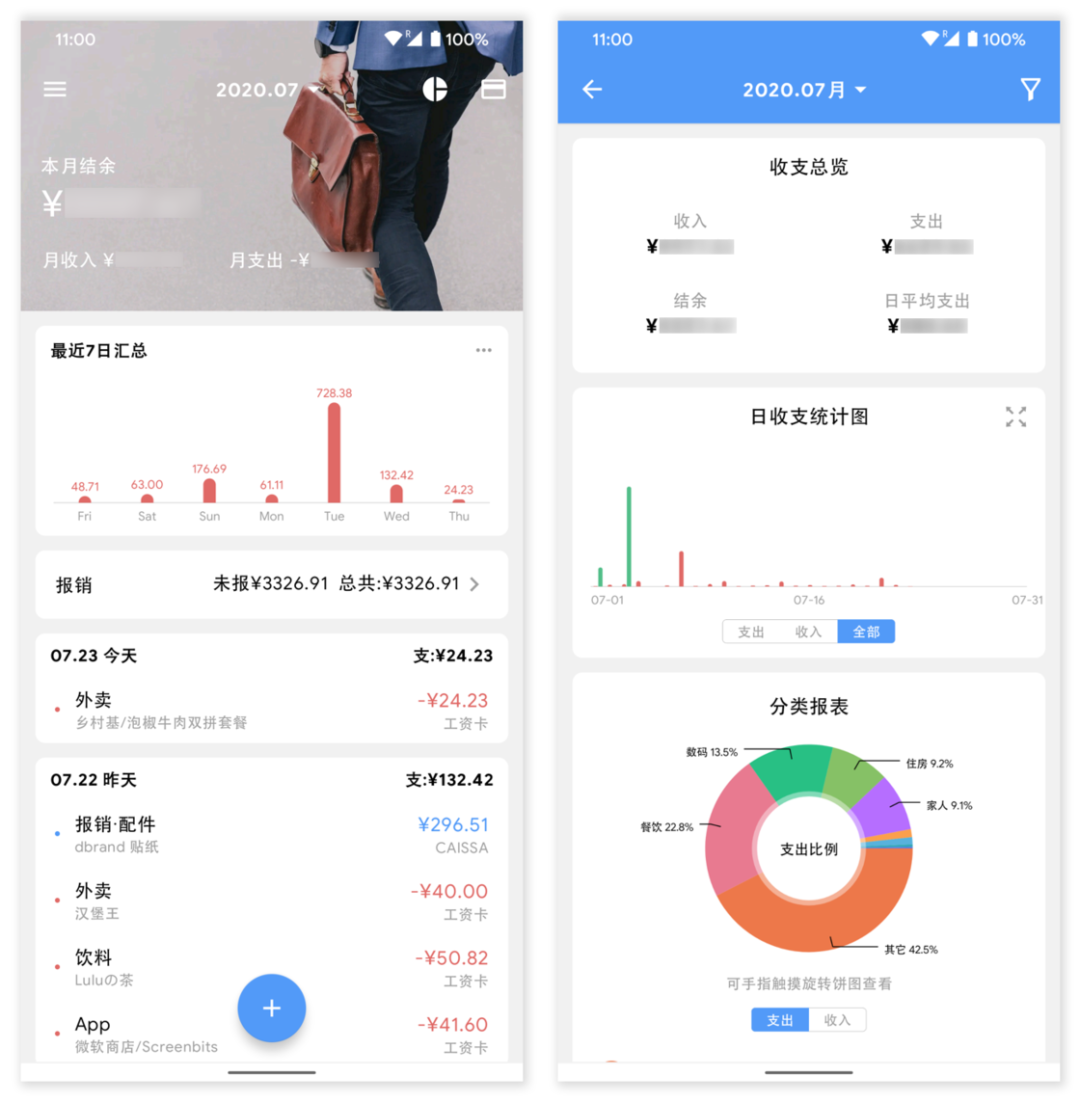 主界面的汇总、报销展示与消费清单(左)| 统计表格界面(右)