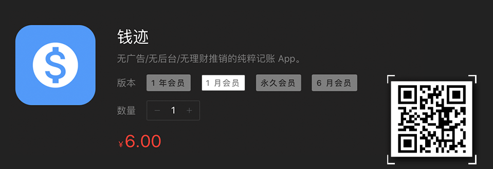 钱迹已上架少数派正版软件商城并提供 1 个月/6 个月/12 个月和永久多种购买方式,你可以在少数派软件商城进行购买。