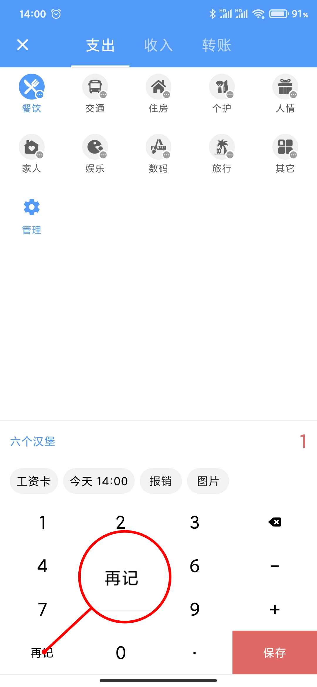 在需要记录多笔消费或支出时,点击数字键盘左下角的「再记」按钮即可提交当前记录并自动进入下一笔记账的信息录入。