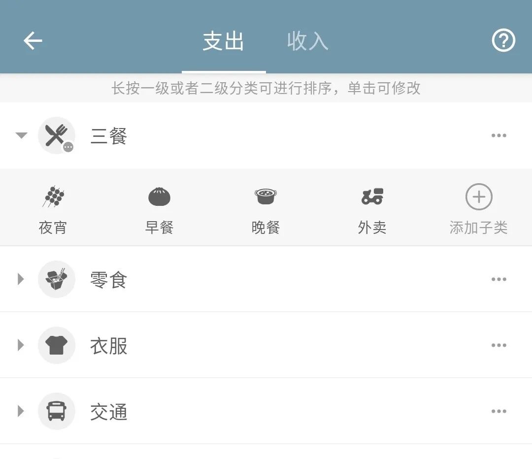 直接在一级目录中将这些子项全部添加会导致类目臃肿不堪,实际上也失去了这个界面的快捷记账属性。这时我可以通过调整二级类目的方式,在三餐这个一级类目下添加更为细致的属性,记账时通过点击二级类目的方式来对消费项目进行分解。