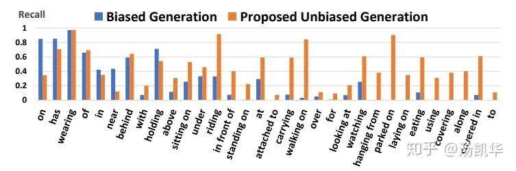 扯远了,回到SGG中。虽然我们还是无法解决用什么标准去评价一个更主观更有意义的SGG,但肯定不是目前最主流的Recall@K,在这种指标下即便模型只学出了on/near/wear/has等少数几种relationship,模型的Recall@K依然非常高,这种场景图对下游reasoning任务的帮助非常有限,简单的来说没有引入足够多的信息量,那么一个最简单的办法,就是让relationship尽可能地diverse,学到尽可能多种类的relationship就有更多信息量了。所以去年CVPR 2019,我在VCTree这篇文章里提了个mean Recall的指标用于评价一个无偏见的场景图,上文也作了介绍。