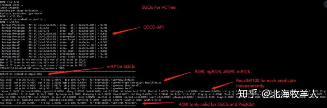 然后关于指标,之前的SGG最大的问题之一,就是过度依赖单一指标Recall@K,而这个指标因为不区分各个类别的贡献加上VisualGenome本身的长尾效应,很容易被过拟合。这导致了近年大多数SGG的文章,只是在过拟合的道路上越走越远,而非真正生成了更有意义的场景图。于是我在该框架中整合了已知的所有指标,也希望后续的工作可以report更多有意义的指标来分析算法有优缺。下图是我代码的一个结果输出样例。