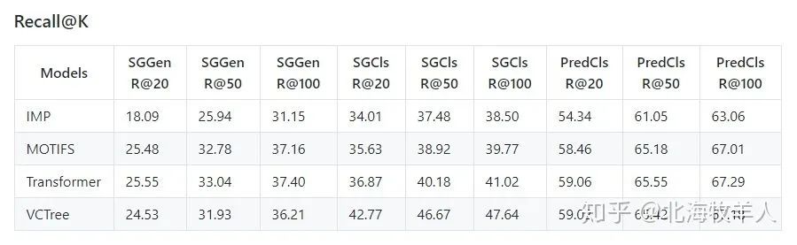 Zero Shot Recall@K (zR@K):在早期的视觉关系识别中,人们也使用了Zero Shot Recall指标,但在SGG中又渐渐被人忽视了,我们在这又重新增加了这个指标,因为它可以很好的展示SGG的拓展能力。Zero Shot Recall指的并不是从来没见过的relation,而只是在training中没见过的主语-谓语-宾语的三元组组合,所有单独的object和relation类别还是都见过的,不然就没法学了。