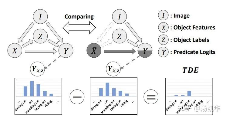 到了今年的CVPR,我们做了一个更大胆的构想。我们将常见的MOTIFS和VCTree等模型归纳为了如下的因果图。因果图中每个节点为一些关键变量,而其中的有向边就是对各种网络forward运算的简化,仅体现了一种因果上的决定关系。
