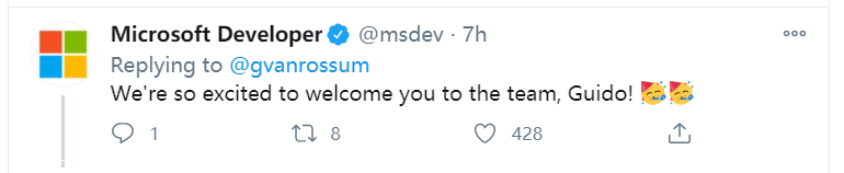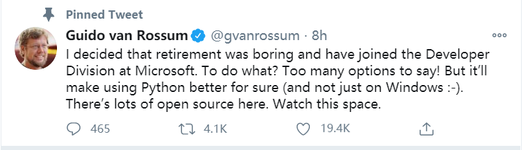 Guido van Rossum 发推表示,在微软他有很多选择,「这里有很多开源」, 他将致力于「确保更好地使用Python(而不仅仅是在Windows上)」。