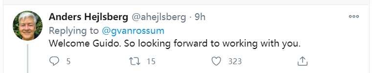 同时,在这条状态的下方,大神 Anders Hejlsberg(Delphi、C#、Typescript 发明人)也表示期待与 Guido van Rossum 一起工作。