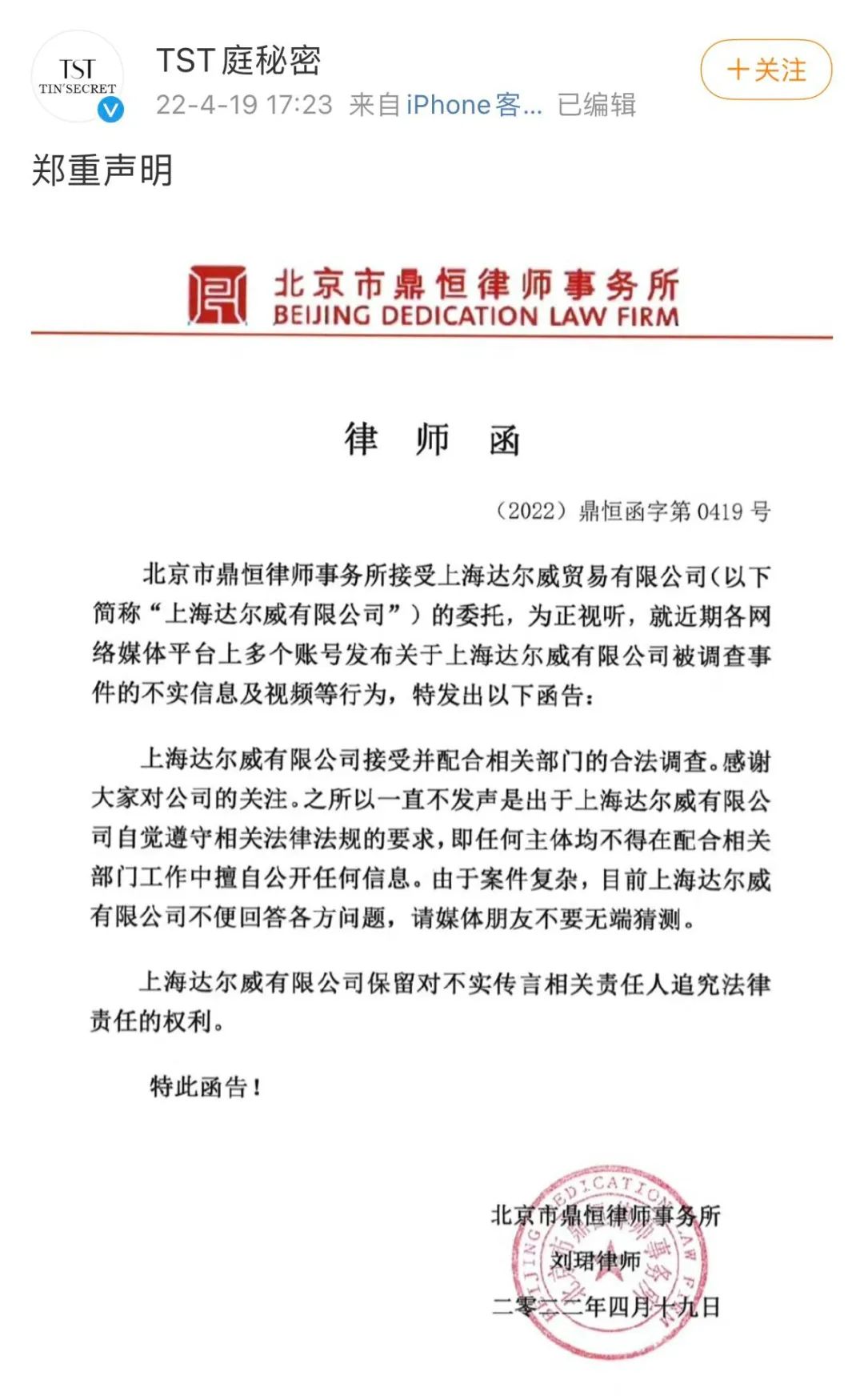 【张庭夫妇公司名下96套房产被查封,价值17亿元】张庭、林瑞阳夫妇创办、经营的达尔威公司因从事传销活动,导致公司名下96套房产被查封,价值17亿元,查封日期是2021年7月20日。这些房产系TST庭秘密在上海的办公大楼。4月19日,达尔威贸易有限公司官方微博发布律师函,称案件复杂,“请媒体朋友不要无端猜测”。(澎湃新闻)