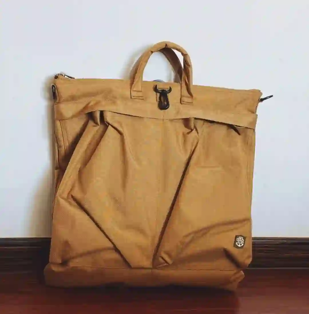 美军在上世纪 50 年代推出了空军头盔包 (Flyers Helmet Bag),旨在让飞行员收纳飞行头盔及其它用品。经过半个多世纪的改进,头盔包在设计上经过了多次变化,也因其简洁、便携、容量大等特点,成为了不少服装品牌复刻的单品。我入手的是国内复古男装品牌 U.Sage 在 2019 秋冬第四季推出、以美军 1973 年款头盔包为原型制作的三用空军头盔包,这款包在前侧保留了双大口袋设计,内部夹层可以轻松收纳 MacBook Pro 及少量衣物,可以满足短途短时间的出差和旅行需求。