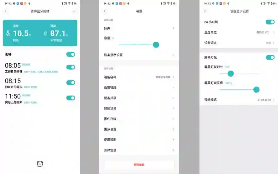 对了,说起温湿度,作为一款来自小米有品的小东西,青萍蓝牙闹钟也毫不意外地能够与米家的其他设备联动:温度低于 20 摄氏度时打开电暖器,湿度低于 20% 打开除菌加湿器……如果你家里已经有其它米家的产品,围绕这么一款百元不到的小闹钟还能实现很多有意思的互动。