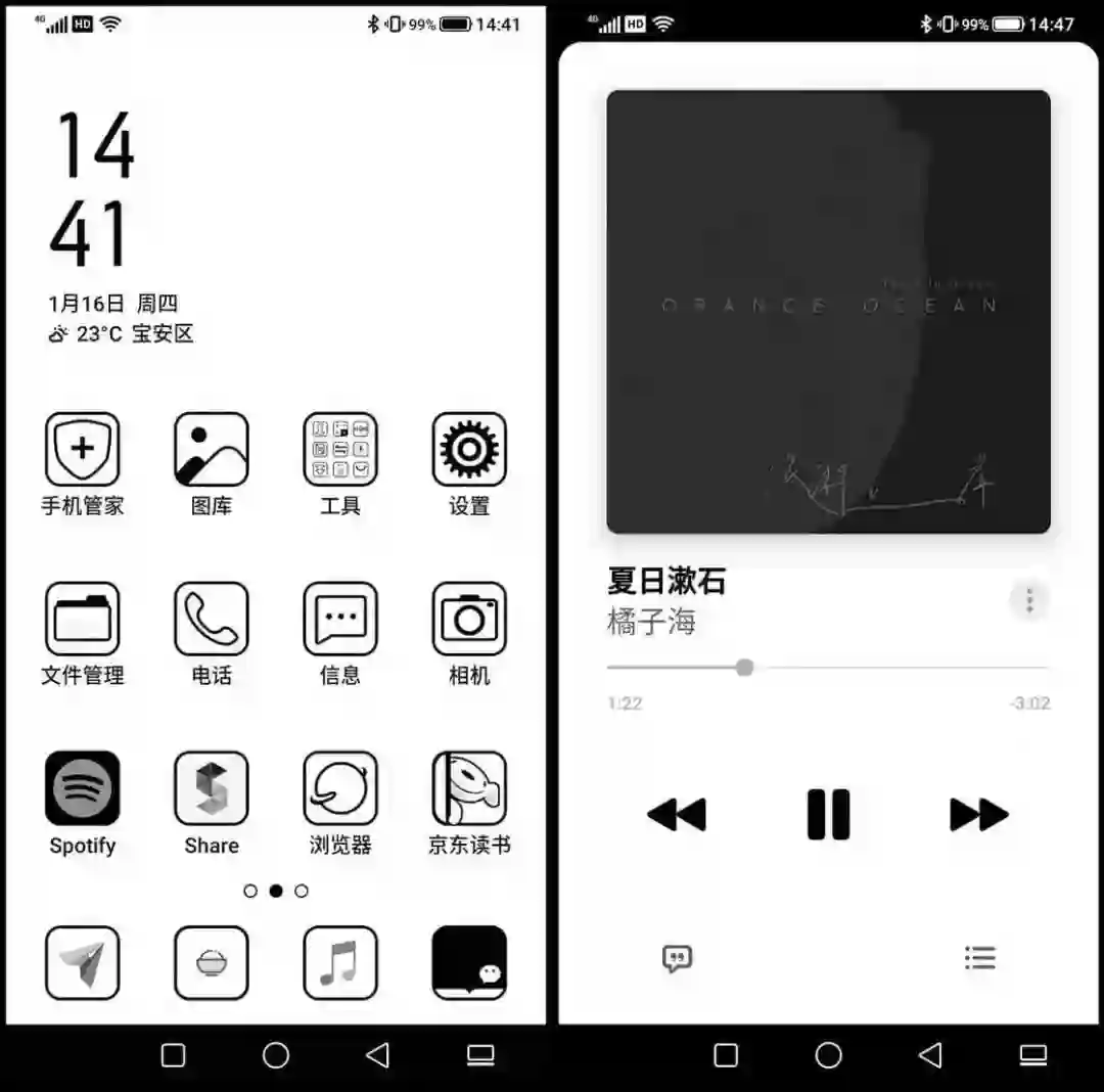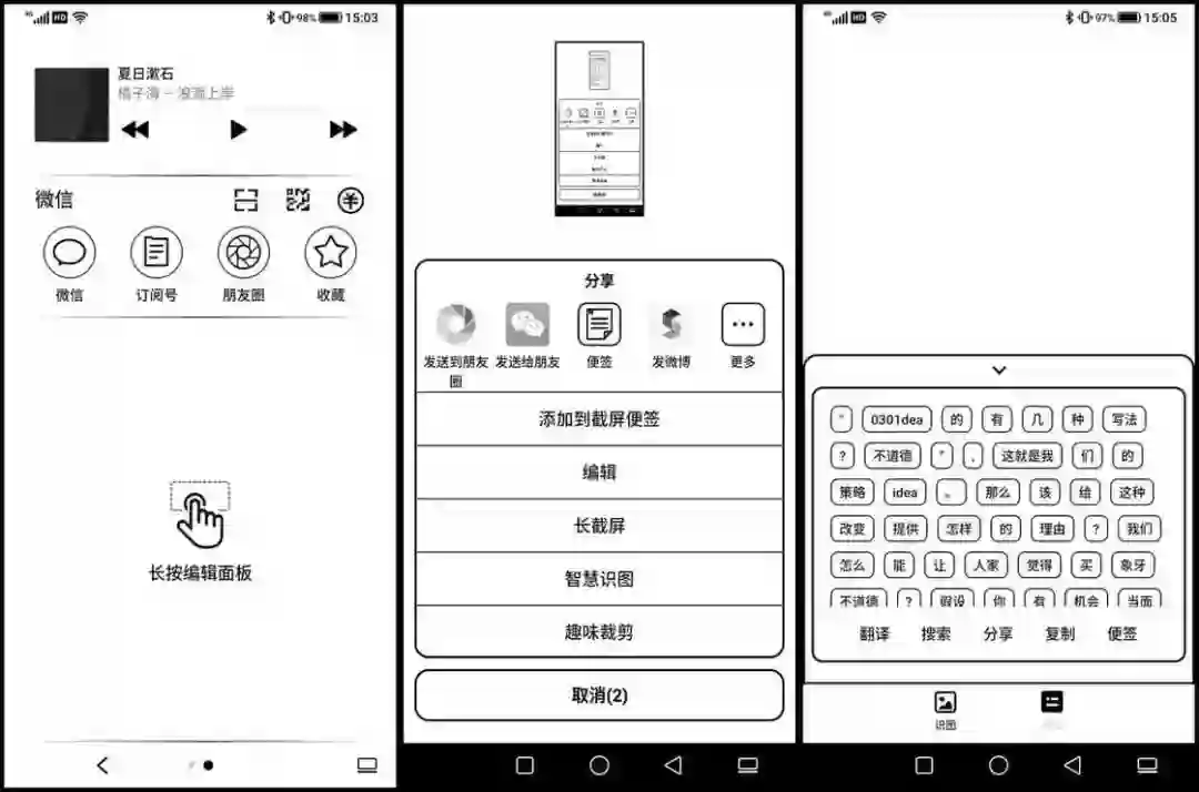 系统方面和其他的 Android 定制版差不多,但还是有不少功能上的亮点。比如通过上滑屏幕进入极简模式,有点只看负一屏的感觉,你可以将想要用的挂件排布在极简模式的桌面上。截屏功能中的长截图、智慧识屏(大爆炸)都还挺有用的,比如现在的微信读书墨水屏版还不能划线收藏,智慧识屏就可以很方便地将屏幕中想要保持的句子识别出来保存到备忘录中。还有清晰模式到流畅模式的切换,在阅读时更显示清晰,非阅读时更好地进行其他操作,看起来没那么卡顿。