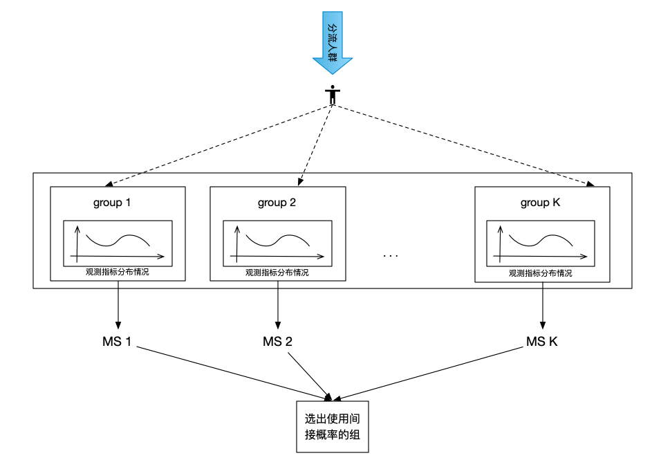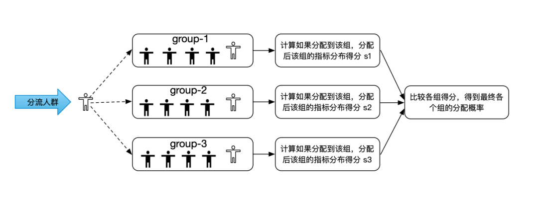 Adaptive分组方法可以在只分组一次的情况下,让选定的观测指标在分组后每组分布基本一致,可以极大的缩小相对误差。相比于传统的CR分组,Adaptive分组的算法更加复杂,在遍历人群进行分组的同时,每个组都需要记录目前为止已经分配的样本数,以及已经分配的样本在选定的观测指标上的分布情况。从分流人群中拿到下一个要分的对象后。会对实验的各个组进行计算,计算该对象如果分配到本组。本组的观测指标分布得分情况。然后综合各个组的预分配得分情况,得到最终各个组对于该实验对象的分配概率。