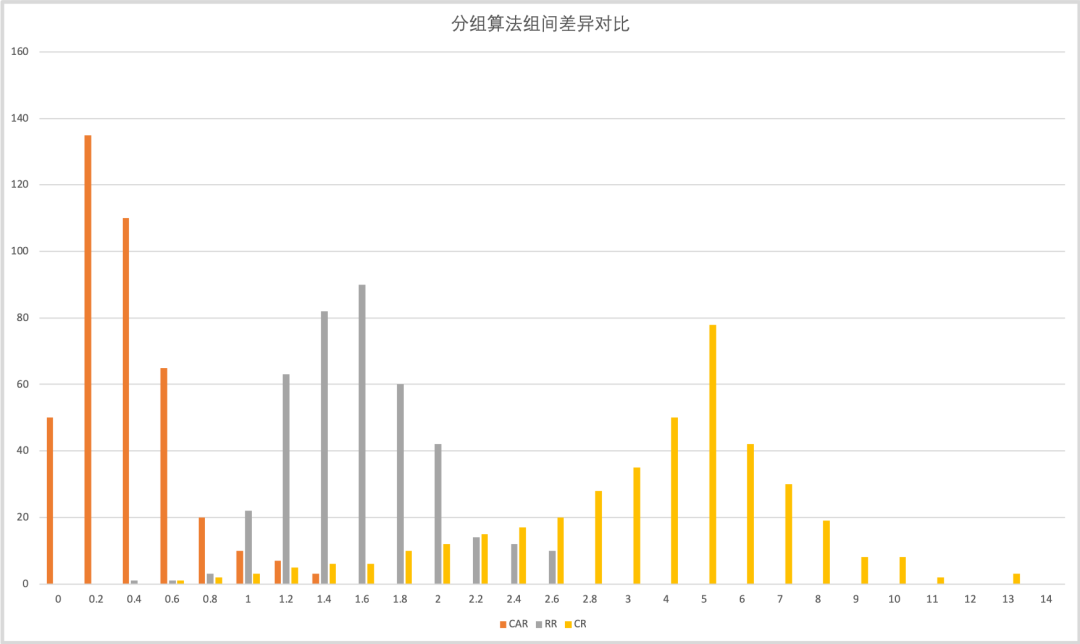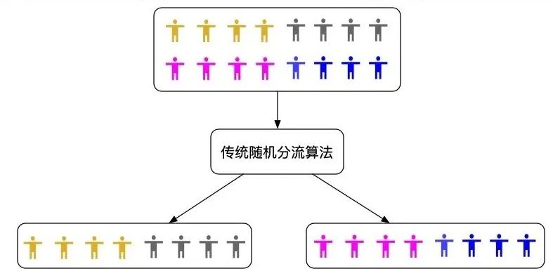 上述的这种分组方式称为CR(Complete Randomization)完全随机分组。进行一次CR,能将一批实验对象分成对应比例的组。但是由于完全随机的不确定性,分完组后,各个组的实验对象在某些指标特性上可能天然就分布不均。均值,标准差等差异较大。如果分组不均,则将会影响到第四步的实验效果分析的进行,可能遮盖或者夸大实验的效果。