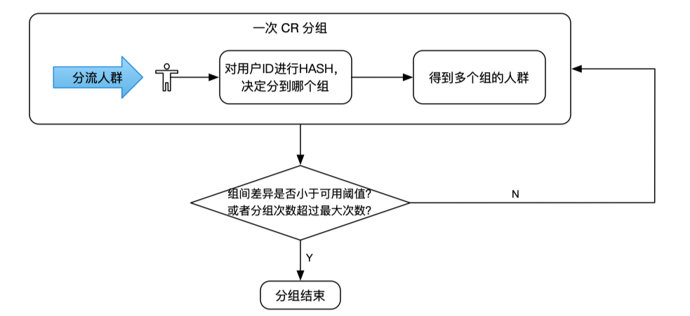 基于CR的风险较大的情况,一般会对CR进行简单的一步优化,即进行RR(Rerandomization)。RR是在每次跑CR之后,验证CR的分组结果组间的差异是否小于实验设定的阈值。当各组的观察指标小于阈值或者重新分组次数大于最大允许分组次数后,停止分组。