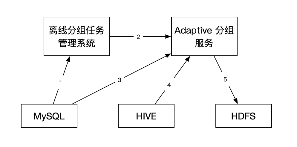 首先分组任务管理系统从数据库中获取需要进行分组的任务。然后根据任务类型调用不同的分组服务。Adaptive分组服务从数据库中获取实验对应的计算信息。根据实验计算信息中的观察指标,从HIVE中获取指标数据,根据人群信息的地址获取人群数据。执行完分组算法之后,将分组结果写入HDFS。