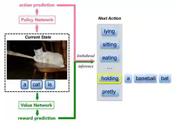 由Snapchat与谷歌合作的这篇论文也使用强化学习训练图像描述生成网络,并采用Actor-critic框架。此论文通过一个策略网络(Policy Network)和价值网络(Value Network)相互协作产生相应图像描述语句。策略网络评估当前状态产生下一个单词分布,价值网络评价在当前状态下全局可能的扩展结果。这篇论文没有用CIDEr或BLEU指标作为目标函数,而是用新的视觉语义嵌入定义的Reward,该奖励由另一个基于神经网络的模型完成,能衡量图像和已产生文本间的相似度。在MS COCO数据集上取得了不错效果。