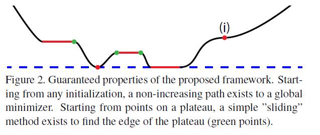 常用深度学习网络中,往往会用到很多非线性函数,如Sigmoid激励函数和ReLu激活函数等,所以整个网络可被看做是一个非线性复合映射函数。这样的函数很大可能是非凸函数,在优化过程中存在很多局部最优解,增加了模型训练难度。但约翰霍普金斯大学的这篇论文证明,在网络构成函数满足一定假设时,能保证得到全局最优解。背后原理是使整个网络的搜索空间只包含全局最优解和平台解,而不存在局部最优解(如下图所示)。