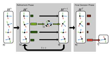 本文由德国德累斯顿工业大学(TU Dresden)与微软联合发表,主要通过强化学习估计物体6D姿态。传统姿态估计系统首先对物体姿态生成一个姿态假设池(a Pool of Pose Hypotheses),接着通过一个预先训练好的卷积神经网络计算假设池中所有姿态假设得分,然后选出假设池中的一个姿态假设子集,作为新假设池进行Refine。以上过程迭代,最后返回得分最高的假设姿态作为姿态估计的结果。