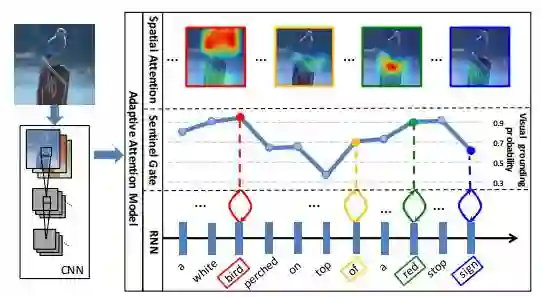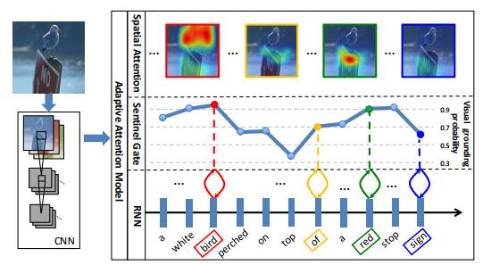 弗吉尼亚理工大学和乔治亚理工大学合作的这篇论文主要讨论自适应的注意力机制在图像描述生成中的应用。在产生描述语句的过程中,对某些特定单词,如the或of等,不需要参考图像信息;对一些词组中的单词,用语言模型就能很好产生相应单词。因此该文提出了带有视觉哨卡(Visual Sentinel)的自适应注意力模型,在产生每一个单词的时,由注意力模型决定是注意图像数据还是视觉哨卡。