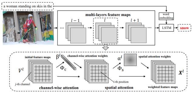 针对图像描述生成任务,SCA-CNN基于卷积网络的多层特征来动态生成文本描述,进而建模文本生成过程中空间及通道上的注意力模型。