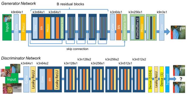 其中在超分辨率有关的工作中,较为值得关注来自Twitter的Ledig等人所著文章[1]。这是第一篇将生成对抗网络(Generative Adversarial Network,简称GAN)思想用于图像超分辨率的研究(具体结构见下图)。以前的超分辨率方法,大都使用平均平方误差(Mean Square Error,简称MSE)导出的损失函数(loss),直接最小化MSE loss虽能得到不错的超分辨率结果,但难以避免细节上的模糊,这是MSE本身设计问题导致的。