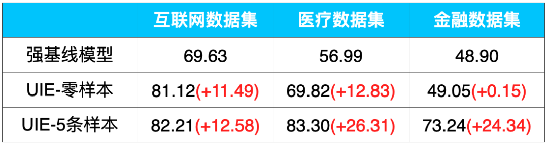 表1:UIE在信息抽取数据集上零样本和小样本效果(F1-score)